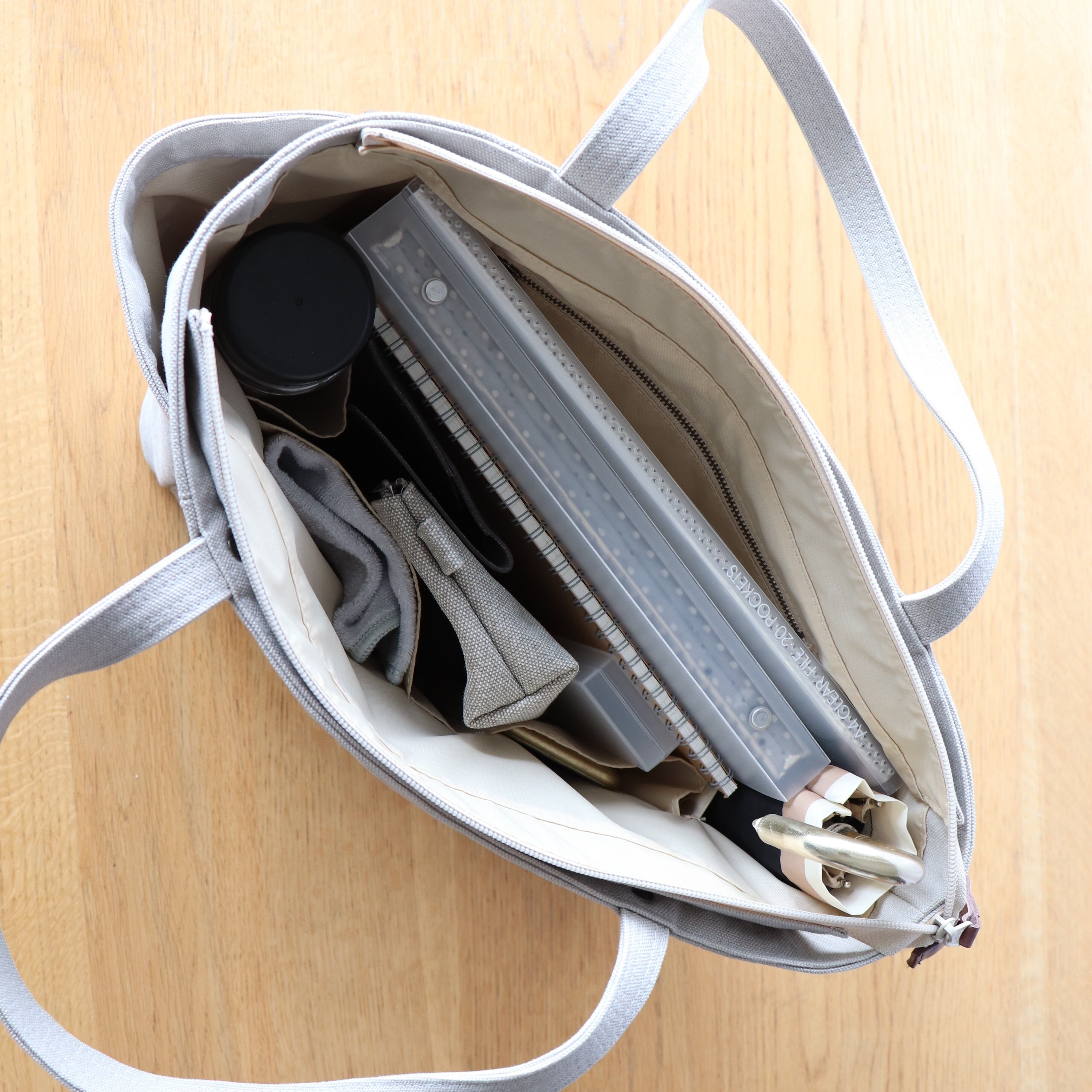 内ポケットは、ファスナーポケット、仕切りポケット、両サイドにも付いているので、傘や財布、ペットボトルもきれいに収納できます。