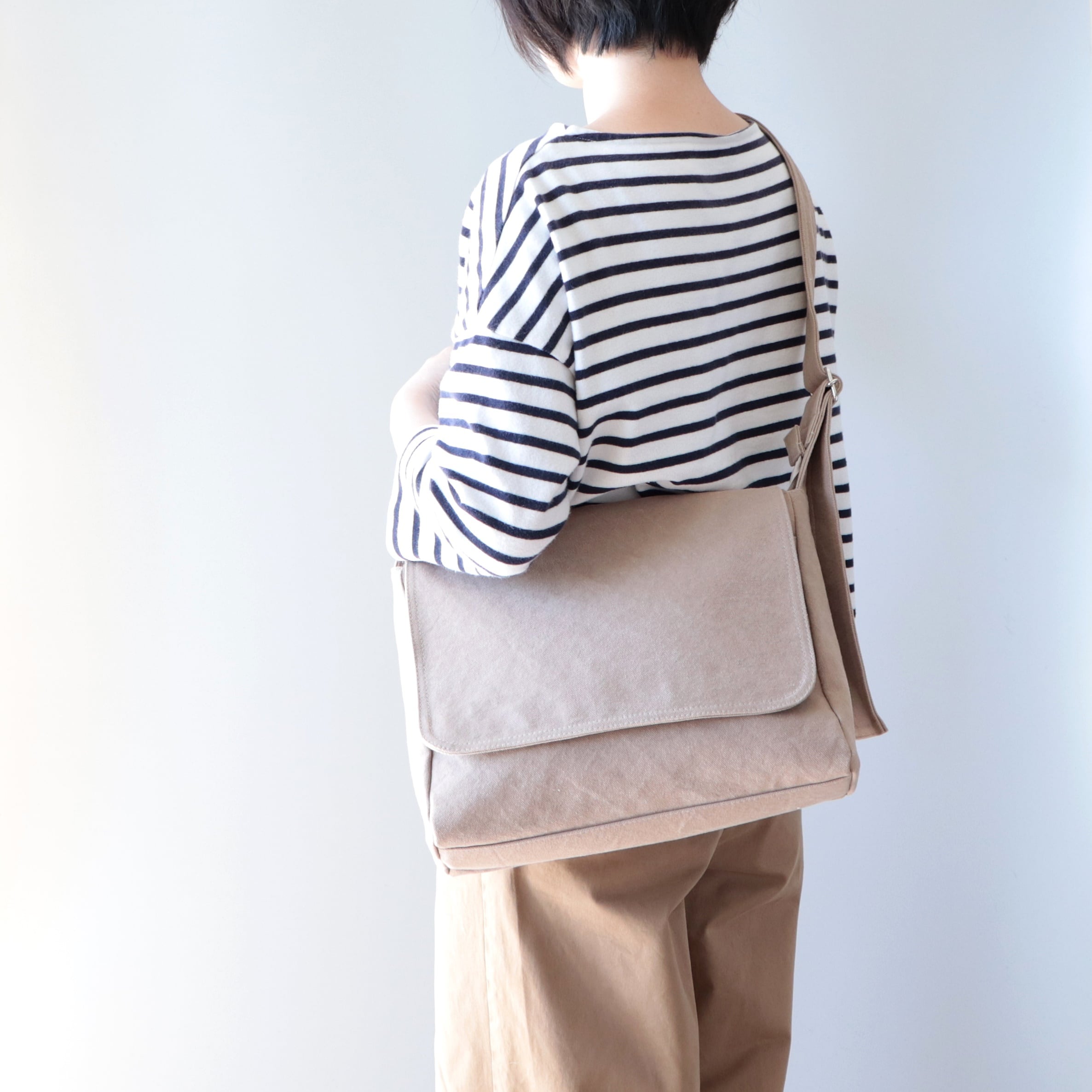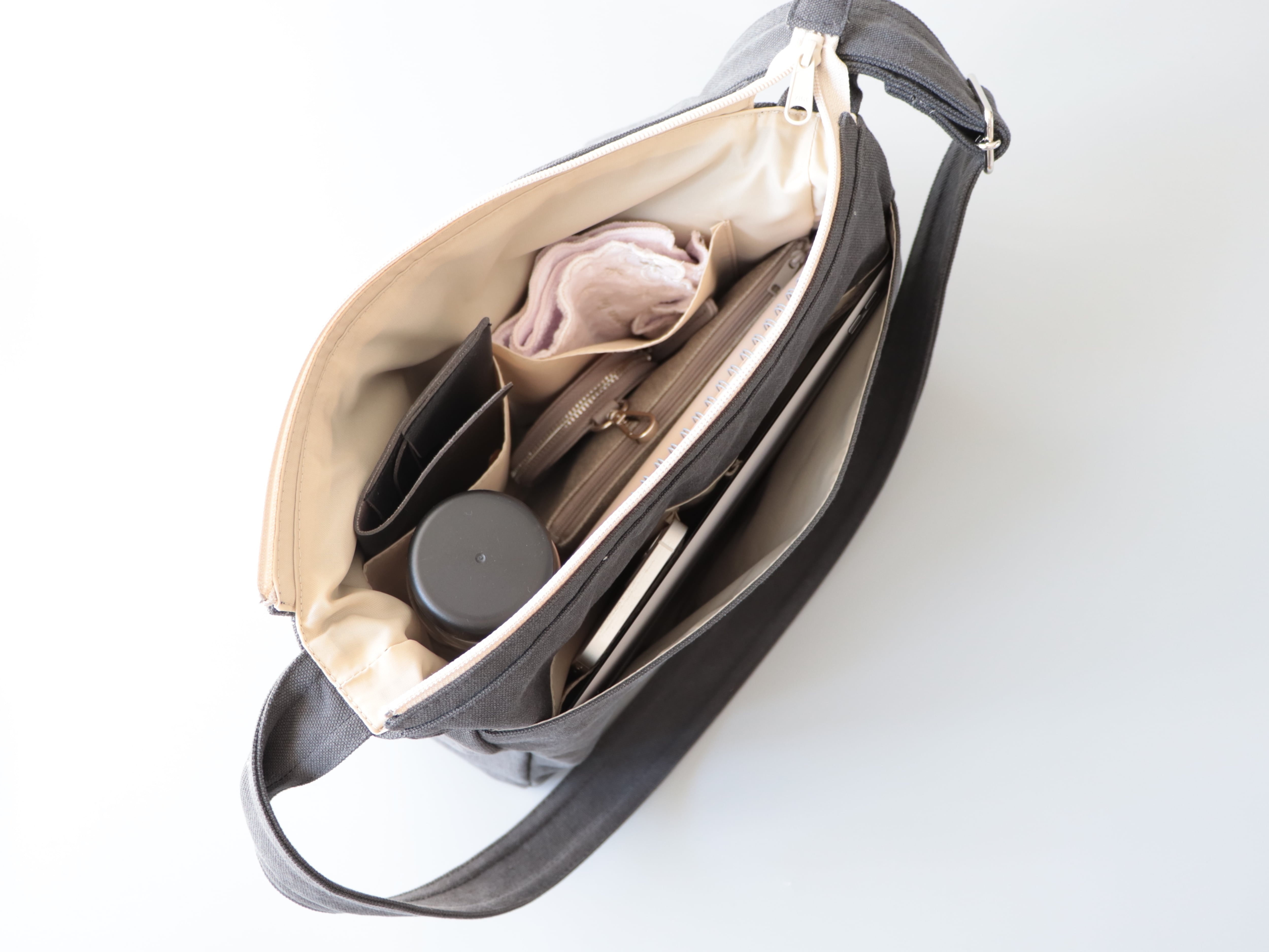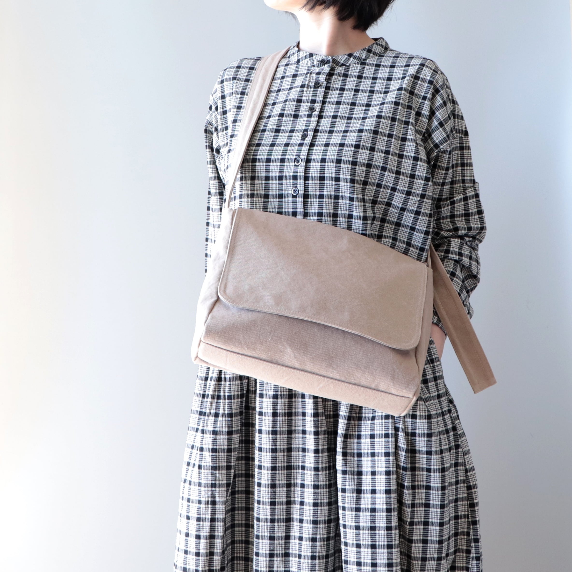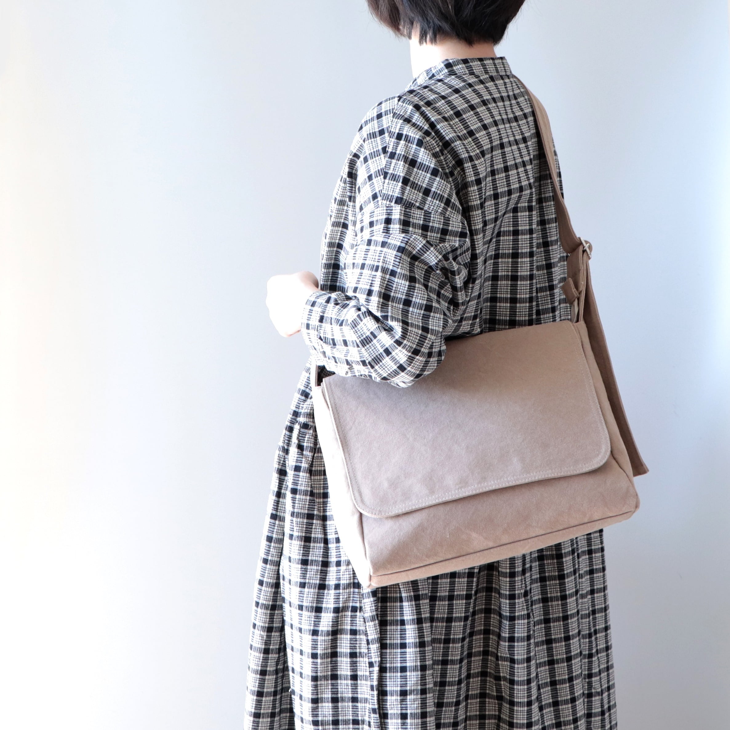 スリムで丸みのあるフォルム、くったりと優しく体にフィットするデザインが、大人の女性向けメッセンジャーバッグという感じです。