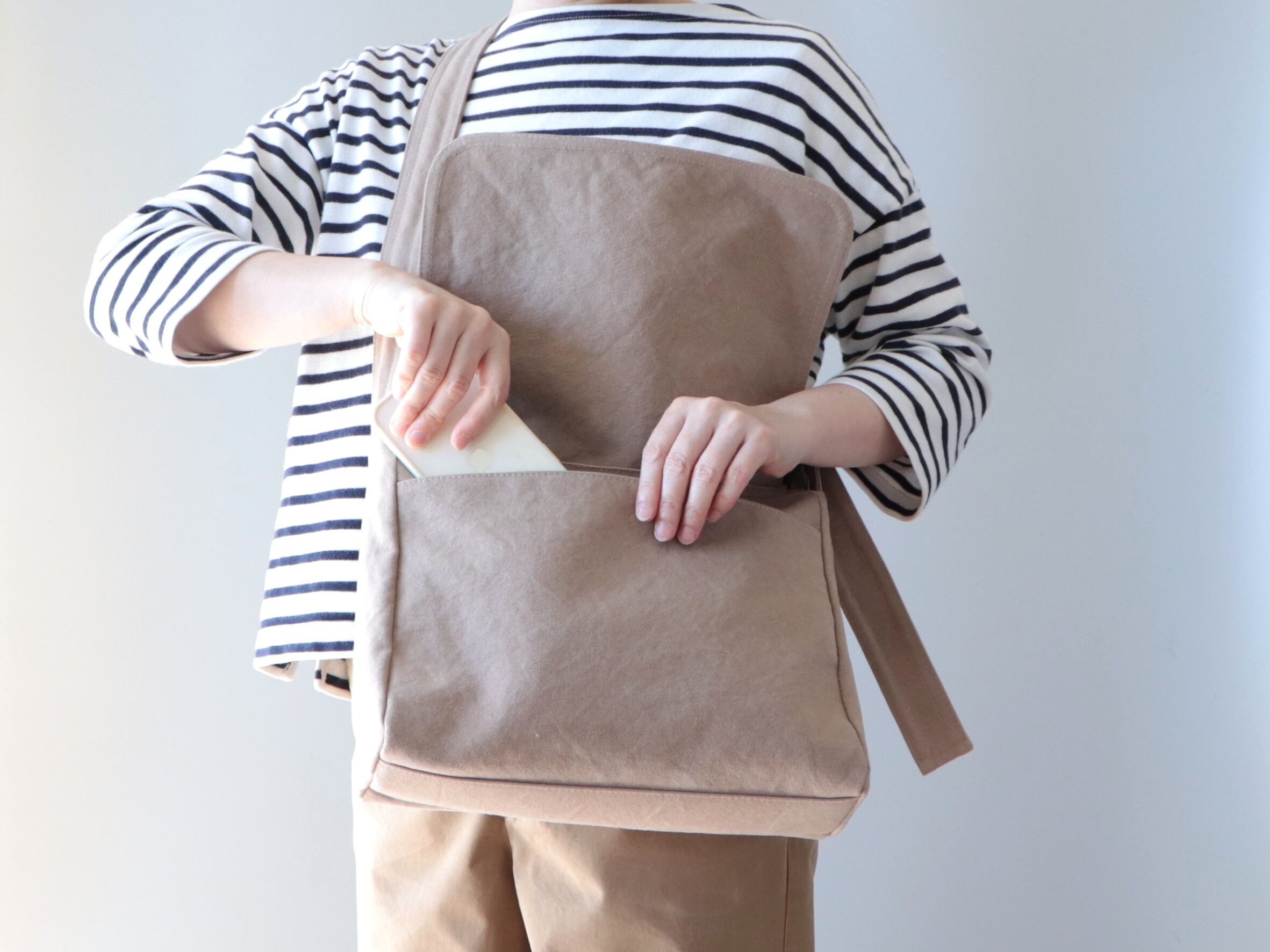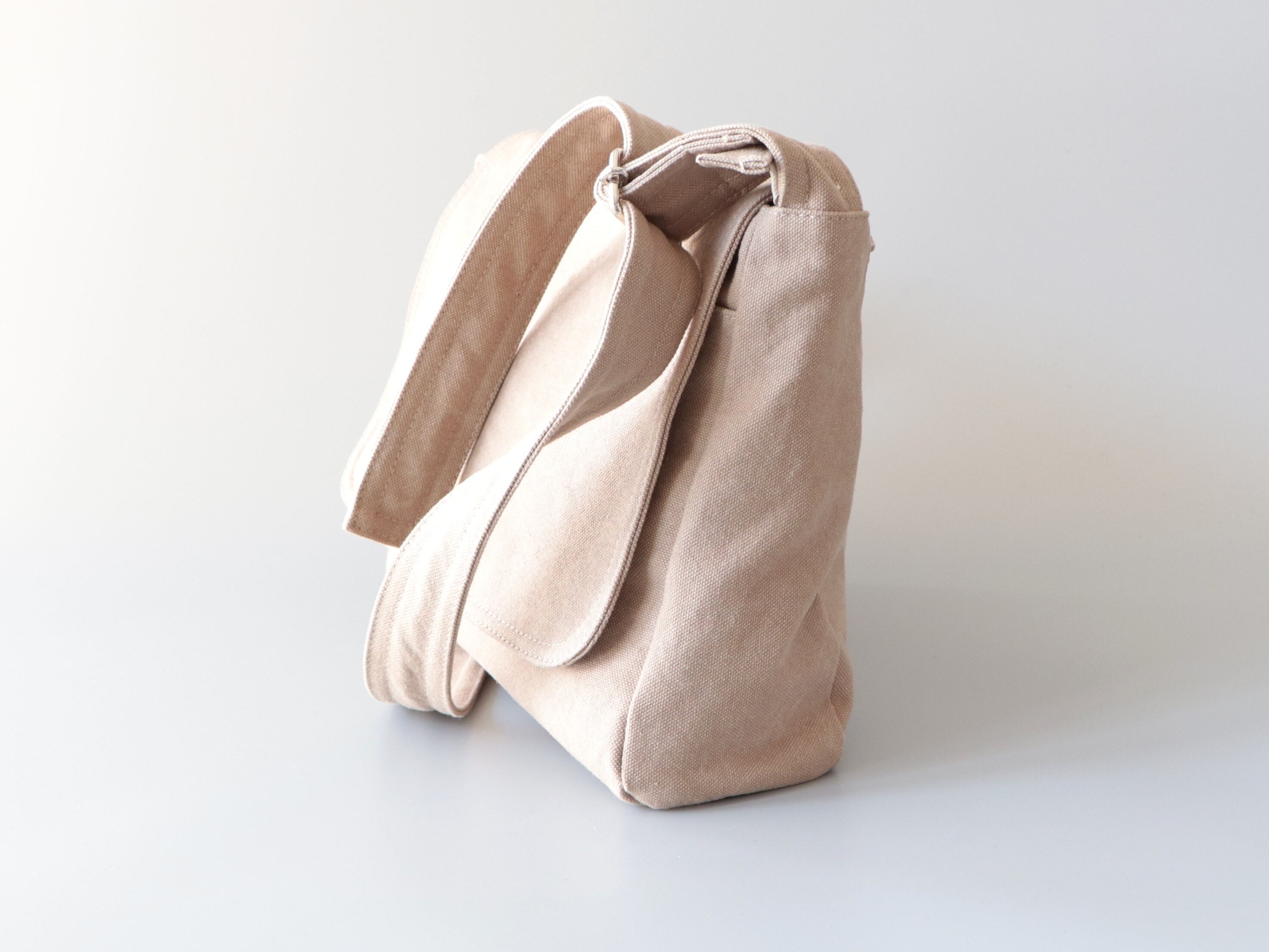 素材は、厚手の8号帆布でありながら、ウォッシュ加工を施した柔らかい特殊生地なので、くったりと体に馴染みます。ショルダー紐も太目の4㎝幅なので疲れ知らず。