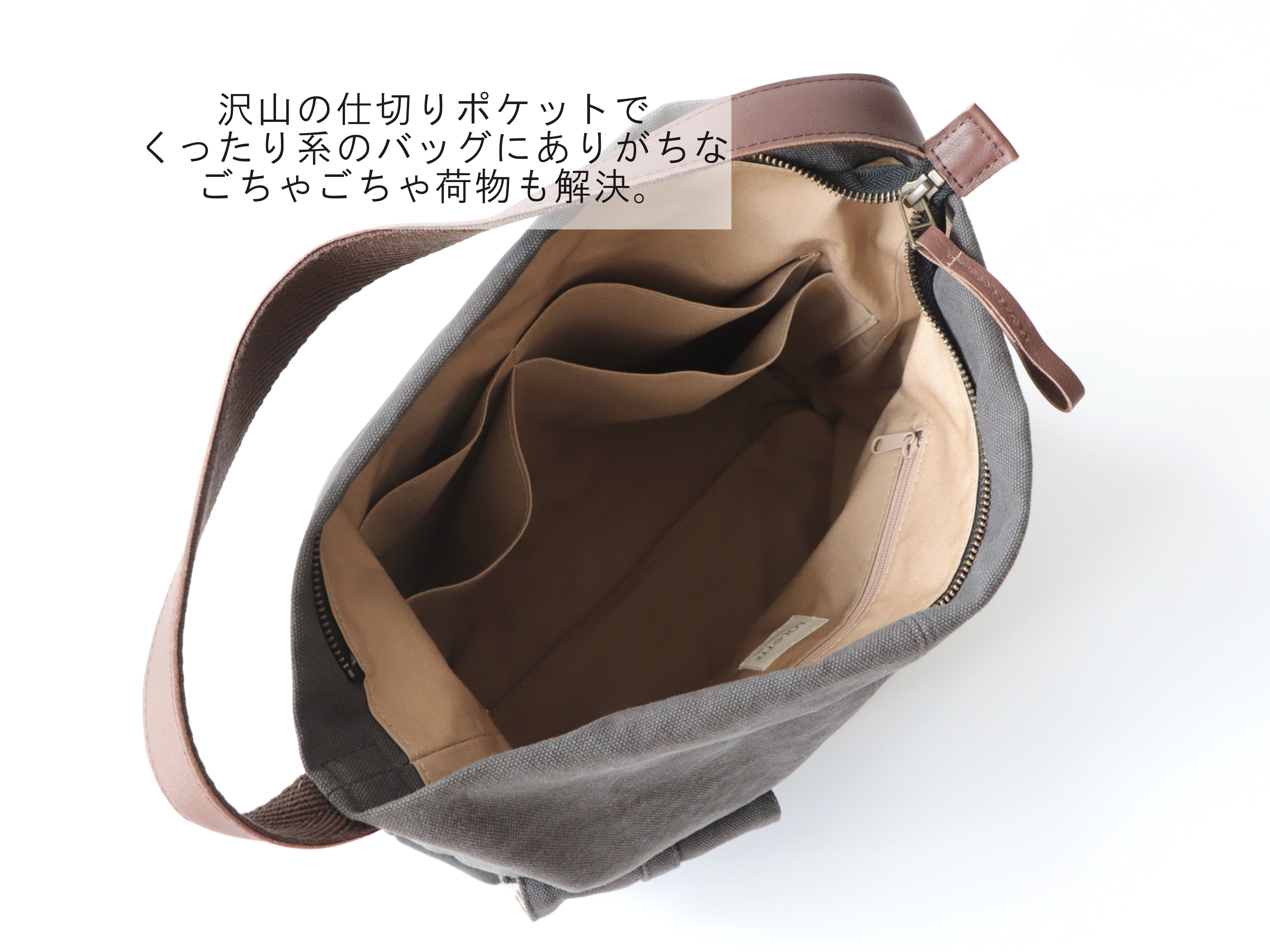 くったり系のバッグにありがちな、中で荷物がごちゃごちゃになる悩みは、仕切りポケットの多さで解決。